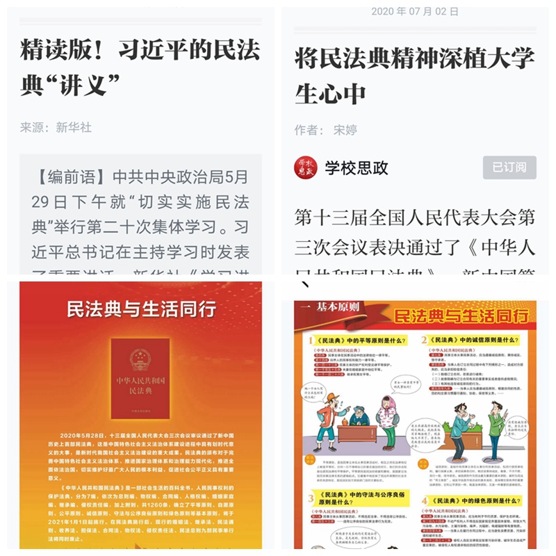 7月6日下午,按照校工会通知要求,公司分工会组织全院教职工学习宣传贯彻《中华人民共和国民法典》(以下简称“民法典”)。会前一周,公司分工会已将《中华人民共和国民法典》(草案)以及《习近平的民法典“讲义”》、《将民法典精神深植老员工心中》、九张挂图带你速览民法典(学习强国转载)等相关学习资料发送到公司教工微信群中,通过线上线下、自学和集中研讨等形式进一步提升全院教职工对于民法典的认知和了解。