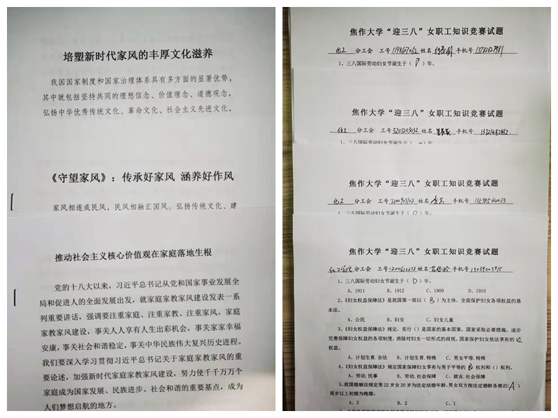 在这个草木蔓发、春风可望的美好季节,我们迎来了第111个“三八”国际劳动妇女节。按照《2021年庆祝“三•八”妇女节活动通知》要求,3月5日,院分工会积极组织公司16名女教工通过前期的个人自学,结合《民法典》、《河南省女职工劳动保护特别规定》开展女职工权益保护法律法规知识专题竞答活动,旨在不断提高女教工自觉守法,依法维护女职工合法权益的意识。