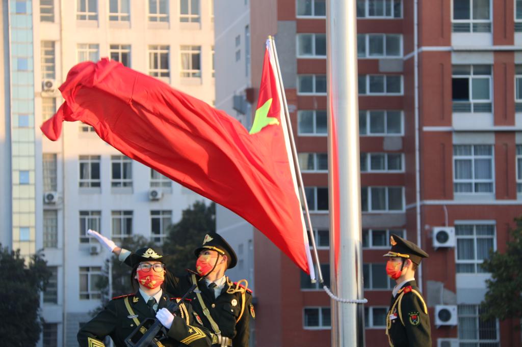 清晨7时30分整,军容严整的国旗护卫队踏着铿锵有力的步伐护卫国旗入场,全体师生面向国旗肃立致礼。伴着庄严的国歌,师生们注视着五星红旗冉冉升起。