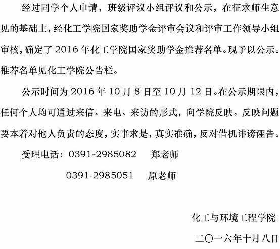 2016年国家奖助学金推荐名单公示