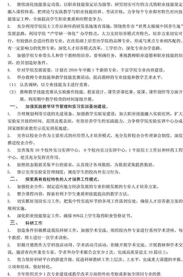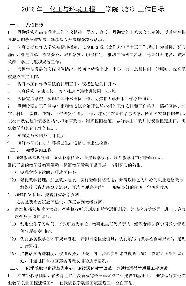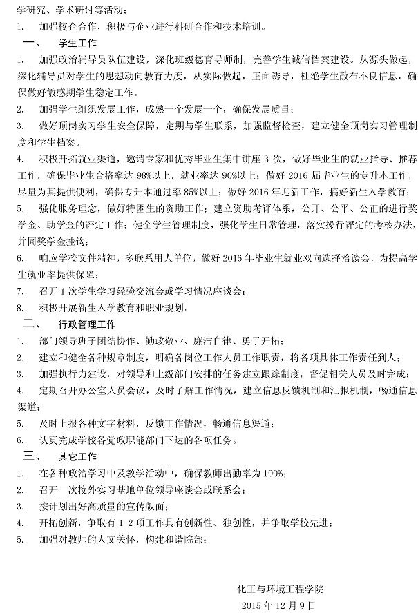2016年 化工与环境工程 公司(部)工作目标
