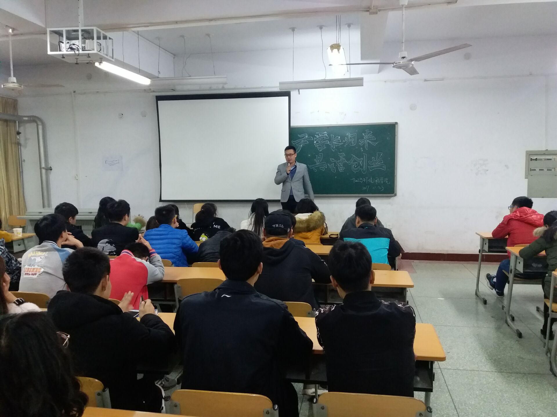 2017年11月23日,yl23411永利优秀毕业生尹建坡学长重归母校,在崇学楼2601教室与2016级员工共话创业与就业。