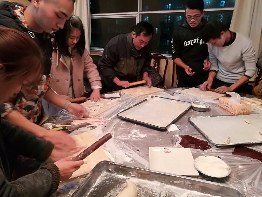 刚进餐厅,同学们就开始亲手实践,和面的和面,擀皮的擀皮,包饺子的包饺子,放饺子的更把饺子放得错落有致,场面很是温馨。