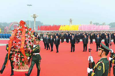 9时57分,胡锦涛、吴邦国、温家宝、贾庆林、李长春、习近平、李克强、贺国强、周永康等党和国家领导人步行来到各界代表方阵前,出席向人民英雄纪念碑敬献花篮仪式。