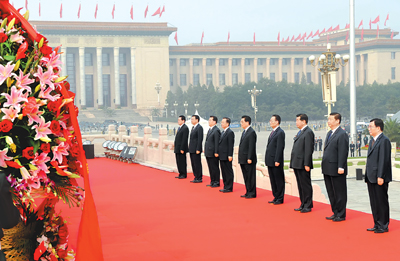 10月1日上午,党和国家领导人胡锦涛、吴邦国、温家宝、贾庆林、李长春、习近平、李克强、贺国强、周永康等来到天安门广场,出席首都各界向人民英雄纪念碑敬献花篮仪式。这是胡锦涛等在人民英雄纪念碑基座前,深切缅怀革命先烈。